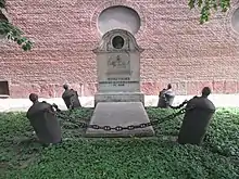 The grave of the naval officer Olfert Fischer is visible through the fence of the Reformed Church. The monument features a relief portrait of Fischer.