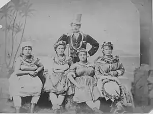 ʻIoane ʻŪkēkē with four hula dancers including his wife and sister-in-law