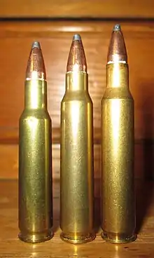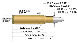 The .222 Remington or 5.7×43mm (C.I.P), also known as the triple deuce, triple two, and treble two, is a centerfire rifle cartridge. Introduced in 1950, it was the first commercial rimless .22 (5.56 mm) cartridge made in the United States. As such, it was an entirely new design, without a parent case.[2] The .222 Remington was a popular target cartridge from its introduction until the mid-1970s and still enjoys a reputation for accuracy. It remains a popular vermin or "varmint" cartridge at short and medium ranges with preferred bullet weights of 40–55 grains and muzzle velocities from 3,000 to 3,500 ft/s (915–1,067 m/s).