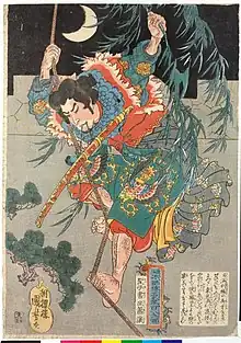| 14 | 14 | Tianshang (天傷); Harm Star (天傷星) | Wu Song (武松; Wǔ Sōng; Wu Sung) | "Pilgrim" (行者); "Tiger-fighting Hero" (打虎英雄) | Chief Wu (武都頭); Grandmaster Qingzhong (清忠祖師) "Wu the Second" (武二郎) | Infantry | Infantry leader | Constable | Qinghe County, Xingtai, Hebei | 23 | Pair of sabres, staff | ![]() | Survives | |