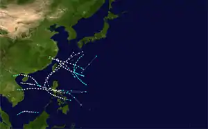 On September 8, a low pressure area formed east of the Philippines. It intensified into a tropical storm while moving to the northwest, passing near the Ryukyu Islands on September 17. After bypassing Taiwan to the north, the storm approached the mouth of the Yangtze in eastern China, before recurving to the northeast. It was last noted on September 21 in the Sea of Japan.[6][16] On the last day of the month, a typhoon formed west of Palau. Steered to the northwest, the storm moved across northern Luzon, hitting Nueva Ecija and Pangasinan. After emerging into the South China Sea, the storm turned to the northeast, brushing the Batanes islands as well as southeastern Taiwan on October 4. Crossing the Ryukyu Islands, the storm was last noted on October 6 to the southwest of Kyushu.[6][17]