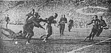 On October 15, 1927, Michigan defeated Wisconsin by a 14–0 score. Michigan's touchdowns were scored by fullback George Rich and left halfback Louis Gilbert. Rich's touchdown came in the second quarter after quarterback Leo Hoffman advanced the ball 26 yards to the one-foot line on a "triple pass".[12] The second touchdown followed a Wisconsin fumble at its own one-yard line with Michigan's left tackle Otto Pommerening recovering the loose ball. Gilbert then scored on a lateral pass from left end Bennie Oosterbaan.[13] Gilbert also kicked for two points after touchdown, though he was injured in the game. Oosterbaan also caught four passes for 79 yards and was credited with being the key to Michigan's defense: "Defensively it was a case of Oosterbaan at all stages. He was the first down the field under punts. He was usually the man who waylaid the [backs] in the Badger backfield."[13]