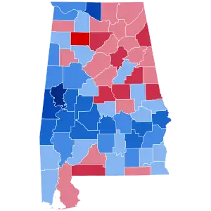 The conflict between disapproval of Smith's faith and policies on one hand and extreme traditional hostility towards the Republican Party in almost all of Alabama (the only exceptions being the historically anti-secession counties of Winston and a few populist strongholds like Chilton) produced an exceptionally bitter campaign.[8] Black Belt whites – who had controlled the state government since the disenfranchisement of blacks and poor whites – also felt Smith's social views obnoxious, especially his opposition to the Ku Klux Klan. Consequently, many of Alabama's voters swore to vote for Hoover without declaring themselves Republicans, instead calling themselves "Hoovercrats".[8] Defections were particularly pronounced in North Alabama, where a contiguous block of counties from Birmingham northeastwards to the Tennessee border uniformly gave majorities for Hoover. Hoover also won a number of counties in the far southern coastal regions, whose soils had always proved unsuitable for cotton plantations.[9] On the other hand, the whites of the black belt, who were like Al Smith "wet" (opposed to prohibition of alcohol), did not bolt from the Democratic Party because of this alcohol issue and their strong view that the Democrats were the best safeguard for white supremacy.[10]