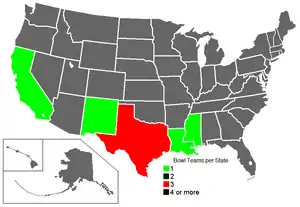 ![]() Number of bowl games per state | |||||||||||||||||||||||||||||||||||||||||||||