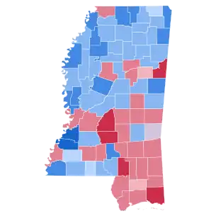 Mississippi was won, fairly consistently with predictions, by Reagan with a slim margin of 1.33 points.[17] However, in future elections, the state would become a Republican stronghold, and no Democratic presidential candidate has carried the state since Jimmy Carter in 1976. As of the 2020 presidential election, this is the last election in which Winston County, Tippah County, Itawamba County, Union County, Prentiss County, Pontotoc County, Lee County, Lafayette County, Attala County, Monroe County, Madison County, Calhoun County, Tate County, Marion County, Leake County, Grenada County, and Franklin County voted for the Democratic candidate, as well as the last time that Clarke County was not carried by the Republican candidate;[19] as Reagan and Carter ended up in a tie in Clarke County.