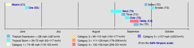 Tropical Storm Beryl formed on August 28, after a quiet July in the open Atlantic Ocean. Beryl grazed Cape Verde, killing 3 people. Tropical Depression Three formed just behind Beryl, tracking east and north of the Caribbean sea in early September. Soon after the dissipation of Beryl, Tropical Storm Chris formed in the Gulf of Mexico on September 9. Chris stayed a weak storm, making landfall near Sabine Pass, Texas, and dissipating over land on September 13. Hurricane Debby was the next storm and the strongest of the season. The formative stage of Debby produced rainfall in Puerto Rico and soon strengthened into a Category 4 Major Hurricane. Debby passed by Newfoundland on September 18 and merged with a non-tropical low on September 20. In mid-September, Tropical Depression Six formed west of Africa, and tracked west-northwest, dissipating before reaching the Leeward Islands on September 20. Its remnant thunderstorm activity continued moving west-northwest, forming Tropical Depression Seven which moved near Bermuda on September 25 before dissipating offshore Nova Scotia. The final storm of the season, Tropical Storm Ernesto, was the shortest-lasting system and stayed out to sea, dissipating on October 3.