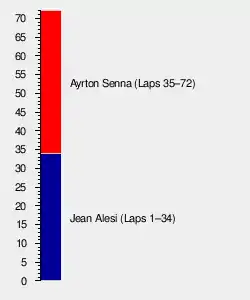When Berger spun, Senna was 8.2 seconds behind Alesi. Not knowing whether the Tyrrell's Pirelli tires would last, Senna was reluctant to push too hard early on. After 30 laps, Alesi remained in the lead, but on lap 34, Senna passed him on the inside. The Tyrrell held the outside line on the exit and retook the lead on the next turn. At the same point, one lap later, Senna took the lead again, and this time he held it.