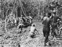In early 1942, the 2/1st returned to Australia as part of the general transfer of Australian ground troops from the Middle East to the Pacific, following Japan's entry into the war. The battalion returned aboard the USS West Point,[9] and subsequently established itself around Ipswich, in Queensland, before being deployed to New Guinea in August aboard the transport Taroona,[10] at the height of the fighting against the Japanese during the Kokoda Track campaign. Initially, the pioneers undertook defensive tasks, with three companies being deployed forward to Owers Corner before moving to Uberi and then on to Imita Ridge, where the Australians sought to make a final stand against the advancing Japanese. There, the battalion occupied the extreme left hand position of a makeshift line alongside the 2/31st, 2/25th, 3rd and 2/33rd Battalions.[11] Later, as the tide of the campaign turned in favour of the Australians, the battalion conducted patrols and portage work along the track from September to November, before being reassigned to carry out mining and labouring work around 9-Mile Quarry, where three companies were deployed. A fourth company was also detached at this time to the Milne Bay area to improve the base's facilities; it remained in New Guinea until October 1943 before returning to Australia for rest and reorganisation aboard the USS Etolin.[12][3]