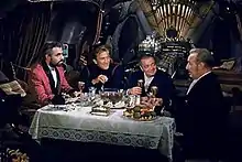 Dinner aboard the Nautilus. From left to right: James Mason, Kirk Douglas, Peter Lorre, and Paul Lukas.