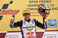 Spanish riders once again dominated the 125cc championship, with a 26-race winning streak for Spanish riders only being broken by Bradley Smith at the final race of the season in Valencia.[12] The top three championship placings went to Spanish riders as Marc Márquez won the championship ahead of Nicolás Terol and Pol Espargaró. With ten victories, Márquez became the second youngest World Champion ever at the age of 17 years, 263 days, with only Loris Capirossi's 1990 triumph coming at a younger age.[13]
