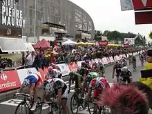 Twenty-two teams participated in the 2014 edition of the Tour de France.[6] The race was the 18th of the 29 events in the UCI World Tour,[7] and all of its eighteen UCI ProTeams were automatically invited, and obliged, to attend the race.[8] On 14 January 2015, the organiser of the Tour, Amaury Sport Organisation (ASO), announced the four second-tier UCI Professional Continental teams given wildcard invitations: Cofidis, Bretagne–Séché Environnement, IAM Cycling and NetApp–Endura.[9] The team presentation – where the members of each team's roster are introduced in front of the media and local dignitaries – took place at the First Direct Arena in Leeds, United Kingdom, on 3 July, two days before the opening stage held in the city. The riders arrived at the arena by a ceremonial ride from the University of Leeds. The event included performances from Embrace and Opera North, in front of an audience of 10,000.[10]