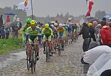 The first stage's bunch sprint finish was won by Marcel Kittel. A crash in the sprint caused Mark Cavendish, a favourite for the win, to fall; he did not start stage two.[42] Kittel gained the race leader's yellow jersey and the green jersey as the leader of the points classification, with Jens Voigt taking the polka dot jersey as the leader of the mountains classification.[43] In the following stage, likened to a "mini Liège-Bastogne-Liège",[44] Vincenzo Nibali took the stage win and yellow jersey, attacking on Sheffield's hilly terrain with 2 km (1.2 mi) remaining. Peter Sagan took the green jersey and Cyril Lemoine (Cofidis) took the polka dot jersey.[45] Stages three and four, finishing in London and Lille respectively, ended in bunch sprints and were both won by Kittel.[46] Crashes in stages four and five forced pre-race favourite Chris Froome to abandon the race; his injuries were later revealed to be fractures to his left wrist and right hand.[47] The weather was wet throughout the fifth stage, with the sett paving causing many crashes (although not Froome's). The fractured ending was won by an attack in the final 5 km (3.1 mi) by Lars Boom of Belkin Pro Cycling. Nibali, who placed third, extended his overall lead over his rivals, with Alberto Contador 2 min 37 s down.[48] André Greipel won stage six's bunch sprint in Reims.[49] Another bunch sprint took place at the end of the next stage, with the hilly finish decided by a photo finish between Sagan and the winner Matteo Trentin (Omega Pharma–Quick-Step).[50]