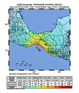 The 2017 Chiapas earthquake struck at 23:49 CDT on 7 September (local time; 04:49 on the 8th UTC) in the Gulf of Tehuantepec off the southern coast of Mexico near the state of Chiapas, approximately 87 kilometres (54 mi) southwest of Pijijiapan (alternately, 101 kilometres (63 mi) south-southwest of Tres Picos),[6] with a Mercalli intensity of IX (Violent).[7] The moment magnitude was estimated to be Mw8.2.[1]