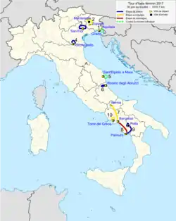 - 5 July 2017 — Roseto degli Abruzzi to Roseto degli Abruzzi, 116.16 km (72.2 mi)[22]