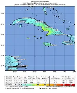 At 2:10 p.m. local time (UTC-5) on 28 January 2020, an earthquake of 7.7 Mw struck on the north side of the Cayman Trough, north of Jamaica and west of the southern tip of Cuba, with the epicenter being 80 miles (130 km) ESE of Cayman Brac, Cayman Islands[4] or 83 miles (134 km) north of Montego Bay, Jamaica.[5] Schools in Jamaica and buildings in Miami were evacuated after shaking was observed in parts of the U.S. state of Florida.[6][7] Light shaking was also reported on the Yucatan peninsula in Mexico.[8] It is the largest earthquake in the Caribbean since 1946.[9] A tsunami warning for the Caribbean Sea was issued by the Pacific Tsunami Warning Center and later withdrawn.[10]