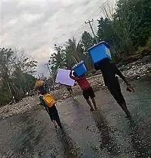 Transport of ballot boxes. Where there are no roads, porters have to bring the material to the polling stations