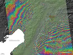 The extent of surface ruptures associated with the M7.8 and M7.7 earthquakes have been mapped using a mixture of satellite imagery and ground observations. Pixel matching on images captured by Sentinel-1 before and after the earthquakes showed sharp discontinuities in displacement, revealing two separate zones of surface rupture. The longer of the pair, produced by the first earthquake, measured 320 km (200 mi) while the second earthquake produced 150 km (93 mi) of surface rupture.[43][74] These observations were backed up with direct imaging of the ruptures using other satellite data, such as from the DigitalGlobe's WorldView-1, 2 & 3 and GeoEye-1,[75] and by field work.[76][70] Remote sensing using satellite imagery indicated 30 km (19 mi) of surface rupture with large normal faulting component.