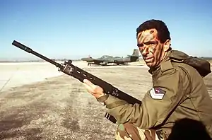 A Uruguayan tactical air controller stands guard over a squadron OA-37 Dragonfly