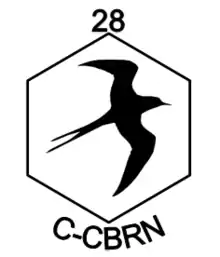 The emblem on the 28 Engineer Regiment flag is a Christmas Island Frigatebird emblazoned on a hexagon. The hexagon was used as an emblem by a number of Royal Engineer Special Warfare Groups in WW1, and draws inspiration from the chemical diagram for the benzene ring, a chemical structure found in a large number of chemical warfare agents. The hexagon remains part of the symbology and iconography adorning identifying badges and emblems of CBRN units and organisations of many NATO partners.