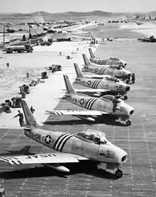 On 15 August 1947, under the Wing/Base (Hobson) reorganization plan, the 4th Fighter Wing was formed, and the 4th Fighter Group became its subordinate operational flying component.[1] Following a period of training with F-80 Shooting Star aircraft, the 4th Fighter Group transitioned to F-86 Sabre jets in March 1949, just in time for advanced training and entry into the Korean War.