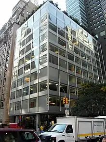Several years after its completion, John Jacobus characterized the building as the "most restrained and perfect of all commercial buildings".[26][107] Ada Louise Huxtable of The New York Times characterized the building as "a kind of Pazzi Chapel of corporate design" in a 1981 article.[50][51] Through the late 20th century, the original Pepsi-Cola Building continued to be praised. Robert A. M. Stern called the original structure "ambiguous in its urbanism but quite distinguished in its aesthetics".[23] Upon Bunshaft's 1990 death, The New York Times wrote that his glass-slab designs like Lever House and the Pepsi-Cola Building "received nearly unanimous praise from the critics".[108] The Coca-Cola Building was one of ten SOM designs described in the 1992 Whitney Guide to 20th Century American Architecture, a list of 200 major designs in the United States during the 20th century.[68][109] After the lobby was divided into storefronts in the 1990s, Herbert Muschamp wrote for The New York Times: "The desecration of 500 Park raises the issue of how effectively landmark laws can protect glass buildings."[101] The 2010 edition of the AIA Guide to New York City described the building as "understated elegance that bowed to the scale of its Park Avenue neighbors".[13]