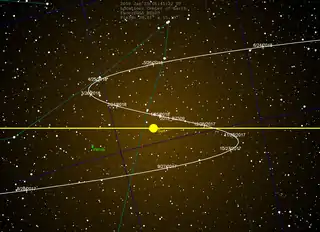 ![]() Retrograde orbit of Kaʻepaokaʻawela with 100-day motion markers | |