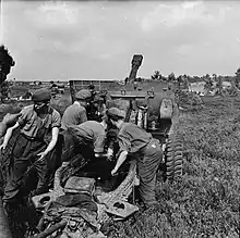 Overlord began with the landings on D Day (6 June 1944). The infantry of 32nd Guards Brigade, accompanied by the WSY, were the first part of the division to cross to Normandy, and came under 43rd (Wessex) Division to act as a firm base for attacks being made across the River Odon (Operation Epsom). On 29 June a German counter-attack against Cheux saw several Panther tanks get through almost to the village, and the WSY in support in the brigade HQ area received the order 'Prepare for tanks'.[29] (Field regiments carried 12 rounds per gun of armour-piercing solid shot for such emergencies.[30])