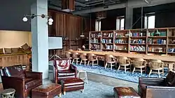 Camille Finefrock designed the building's gardens and interiors. The courtyard garden at the heart of the building was designed as a serene "portrait of the woods" for staff to connect with the nature that historically grew at the building's site through their nearest window. The courtyard features plants indigenous to Long Island and the Northeast, with ferns, swamp azalea, river birches, and a meditation stone beneath a redbud tree.[4] Sondresen compared the layout to a Renaissance palazzo where the building is lit from inside:[27] Three of the courtyard's four walls are glass, and the fourth is patinated Corten steel[28] with a Japanese-style rain chain.[4] Finefrock designed the rooftop garden in sandy soil to reflect the building's indigenous environment and its proximity to the ocean, with elements from the Long Island Pine Barrens, coastal plants, beach plum trees. A gravel path divides in two and allows a user the choice between a direct route across the roof or a more meandering enclosed philosopher's walk. Also on the roof are fruit, vegetable, and cut flower gardens for staff to collect blueberries, kale, tomatoes, and flowers for their desks. Inside, Finefrock chose vintage furniture, topographical maps and brass animals to complement the full library of books that she sourced from the estate of Frank H. Pearl, investor and founder of Perseus Books Group. Custom standing lamps illuminate leather reading chairs, a small cabinet of curiosities holds a rotating selection of objects evoking a sense of wonder befitting of factories for creative technology, both pencils and Kickstarter.[4]