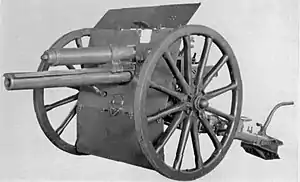 The US decided early in World War I to switch from 3-inch (76 mm) to 75 mm calibre for its field guns. Its preferred gun for re-equipment was the French 75 mm Model of 1897, but early attempts to produce it in the US using US commercial mass-production techniques failed, partly due to delays in obtaining necessary French plans, and then their being incomplete or inaccurate, and partly because US industry was not equipped to work to metric measurements.[2] By 1917 US firms had produced 851 QF 18-pounders for export to Britain. Hence production of a 75 mm version offered a simple interim solution, being basically a copy of the British QF 18-pounder rechambered for French 75 mm ammunition, utilizing existing production capacity.[3] It remains very similar to the 18-pounder, the main visible difference being a shorter barrel with straight muzzle.