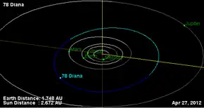 Diana (minor planet designation: 78 Diana) is a large and dark main-belt asteroid. It was discovered by German astronomer Robert Luther on March 15, 1863,[6] and named after Diana, Roman goddess of the hunt. The asteroid is orbiting the Sun at a distance of 2.620 AU with a period of 4.24 years and an eccentricity (ovalness) of 0.207. The orbital plane is tilted at an angle of 8.688° relative to the plane of the ecliptic.[2] Its composition is carbonaceous and primitive.