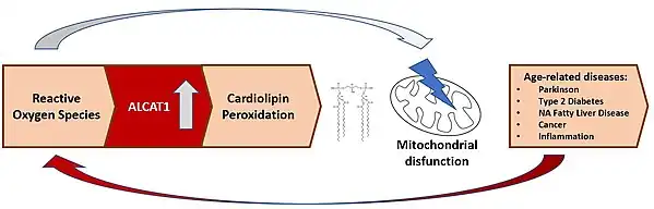 ALCAT1 controls mitochondrial cause for age-related diseases in response to oxidative stress. ALCAT1 expression is up-regulated by ROS from oxidative stress associated with age-related diseases. Cardiolipin remodeling with poly-unsaturated fatty acids by ALCAT1 causes cardiolipin peroxidation, leading to a vicious cycle of ROS production, cardiolipins peroxidation, and mitochondrial dysfunction, which promotes the development of age-related metabolic disease.[6]