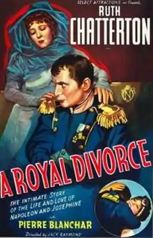 A Royal Divorce is a 1938 British historical drama film directed by Jack Raymond and starring Ruth Chatterton, Pierre Blanchar and Frank Cellier.[1] The film portrays the complex relationship between Napoleon I of France and his wife, Josephine Bonaparte from their first meeting until their divorce more than a decade later.[2] It was shot at Denham Studios in Buckinghamshire.[3] The film's sets were designed by the art director David Rawnsley.