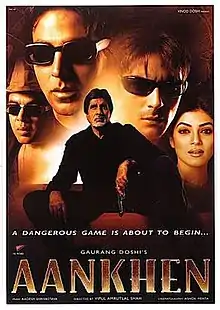 Aankhen (transl.Eyes) is a 2002 Indian Hindi-language heist thriller film directed by Vipul Amrutlal Shah, starring Amitabh Bachchan, Akshay Kumar, Arjun Rampal, Sushmita Sen, Paresh Rawal and Aditya Pancholi. The film is an adaptation of Shah's own Gujarati stage play Andhalo Pato (Blindman's Buff).[2]