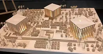 The three cubic houses of worship sit upon a secular visitor pavilion,[12][13] and aim to represent the diverse worshippers, residents, and visitors of Abu Dhabi. Adjaye highlighted that he wanted to “create a building that starts to dissolve the notion of hierarchical difference – it should represent universality and totality – something higher, that enhances the richness of human life".[12][14] The design of this religious complex comprises three unaligned cubes sitting on a plinth, and each of them has a different orientation.[13] The silhouette of the building makes the cubes look unified, and each of them is illustrated with colonnades, screens and vaults.[13] The site also includes a cultural center that will promote the values of mutual respect and peaceful coexistence while the unique character of each faith is preserved.[5]