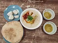 Hummus served ay Abu Hassan, with egg, pitas and onions