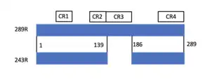 The adenovirus early region 1A (E1A) 289R protein is composed of 289 amino acids, with four conserved regions: CR1 (42-80), CR2 (115-137), CR3 (145-191),[14] CR4 (240-289). In 243R, the CR3 is absent. These conserved domains are responsible for the protein-protein interaction and the regulation of cell cycling and cellular responses. Overall, the intrinsic structure of E1A is highly disordered, meaning that it lacks a single, three-dimensional structure.[15]