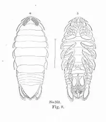 The Aegidae are a family of isopod crustaceans. The adults are temporary parasites of fish, feeding on their hosts' blood before dropping off to digest the meal.[1] They differ from members of the family Cirolanidae in having only three pairs of hook-like pereiopods, whereas in Cirolanidae all seven pairs of pereiopods are hooked.[2] The family was first described by Adam White in 1850.[3]