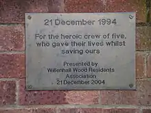A brass plaque remembering the event is now located in Middle Ride, close to the crash scene, which was erected on the 10th anniversary of the accident by the Willenhall Wood Residents Association.[4]