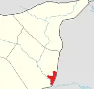 Al-Barakah Province generally claimed all of al-Hasakah Governorate as its territory, though it never fully controlled the region.[3][4][6][19] By early 2016, al-Barakah Province's headquarters was al-Shaddadah, while the province had been reduced to southern al-Hasakah Governorate.[1] Following its demotion to district and move south, the administrative division covered Hajin[lower-alpha 2] and the villages of al-Baghuz Fawqani, al-Sayyal and Hasrat (which ISIL calls al-Khayrat) and Mawzan near the Euphrates, all of them part of the Abu Kamal District. Furthermore, the village of al-Bahra near Hajin was already part of al-Barakah since late 2017. Al-Barakah district in its current form is bordered by al-Furat district to its west and al-Khayr district to its northwest.[3][13]