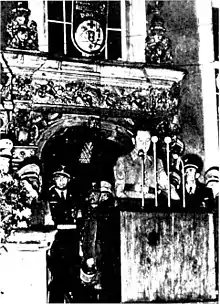 In 1939, following orders from Berlin, Forster led the agitation in Danzig to step up pressure for annexation by Nazi Germany and proclaimed that in future "Poland will be only a dream".[8] On 23 August Forster replaced Greiser as Danzig's head of state. The Danzig issue was one of the pretexts used for the Nazi invasion of Poland in 1939. He was hateful of Jews whom he called "dirty and slippery race" and he expressed his desire to control parts of Poland after Poles would be expelled from them.[9]