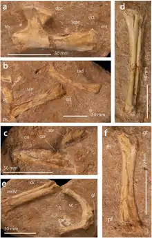 A, humerus of holotype; B, radius and ulna of holotype; C, sternum of holotype; D, referred metacarpal IV; E, metacarpal IV and scapulocoracoid of holotype; F, femur of holotype.