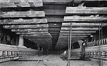 In order to accommodate the space needed for the underpass, the existing track needed to be lowered by more than seven feet (2 m). To achieve this task whilst still keeping the track open during the day, the bed underneath the track was excavated and the track held up by a timber trestle framework. Once excavation was complete and the new station had been constructed around the site, an army of over 900 workmen lowered the whole track simultaneously in one night using overhead hooks to suspend the track when necessary.[12] The hooks still remain.