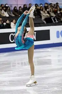 Making her senior Grand Prix debut at the 2019 Internationaux de France, Kostornaia ranked first in the short program, incorporating a triple Axel into it for the first time.[21] She then became the fourth woman ever, after Mao Asada, Rika Kihira and Elizaveta Tuktamysheva, to land two fully rotated triple Axels in a free skate, placing first in the segment with a personal best score of 159.45 points. She took the gold medal over training mate and reigning World and Olympic champion Alina Zagitova by a margin of 19.94 points.[18] At the 2019 NHK Trophy, Kostornaia performed a clean skate with a successful triple Axel to place first in the short program, 5.15 points over Rika Kihira, who also landed a triple Axel, and set a new world record score of 85.04 for the ladies' short program at the senior level.[22] In the free, she again placed first and won the event with a personal best total score of 240.00. Kostornaia became the top qualifier for the Grand Prix Final in Torino, with two gold medal finishes and 30 points overall.[23]