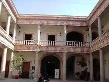 It measures 72 by 68 metres, with a height of 23 metres, and occupies an area of 4,828 square metres. It is constructed on the side of a hill and two of its sides are surrounded by elevations.[4] There are no ornamental facets on the exterior, except for a few windows at the top of each storage room.[5] It has cornices built in a Doric style, constructed with two types of regional stonereddish and greenish. This gives it a curious appearance, resembling a stronghold or a castle, which it has come to be called by the people of Guanajuato. In the interior, there is a porch that leads to a spacious central patio. The porch contains Tuscan columns and adornments. There are two staircases that lead to the upper floor. The Grain Exchange building has only two access doors, a small one facing the east, adorned by two columns, and a large door of the same basic style, facing the north. The edifice was used for the buying and selling of wheat, corn, and other grains.[6] Prior to the Mexican independence from Spain, it was used as a warehouse, military barracks, and prison. Currently it serves as a regional museum.[5]