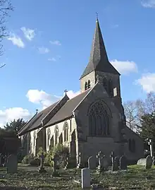 All Saints Church, characterised by architectural historian Nikolaus Pevsner as "a serious job, outside and inside",[8] is a Gothic Revival-style building, variously described as in the Decorated style of around 1300,[1] "Early Geometrical" (i.e. a 19th-century interpretation of the transition between Early English and Decorated Gothic)[7] and "15th-century Gothic".[13] It has a chancel and nave with a chancel arch between them, an aisle on the north side of the nave, a porch on the south side and a northeast tower topped with a broach spire laid with oak shingles.[1][2][8][13] The whole church is built of local stone.[7]