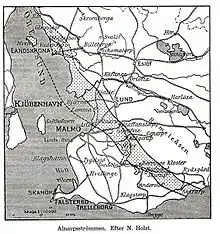 Alnarpsströmmen is a subterranean aquifer under the Swedish province of Scania. It has been used for wells since at least the 18th century and as a fresh water source for Malmö since 1901. Several other towns use it today.[1] Due to its artesian character, wells occasionally turn to fountains. About 400 litres of groundwater naturally flow into Öresund from Alnarpsströmmen every second through quaternary moraine.[2] The width of the aquifer is around 20 km, and the flow of the water is just 10 metres a year.[3]