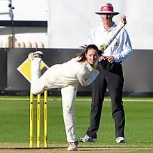 Inspired by Australian Test cricketer Shane Warne, Wellington taught herself to bowl leg spin in her backyard.[2] Wellington began her career playing for Port Adelaide Cricket Club. She rose to prominence in December 2011 when she was the player of the tournament in the national under-15 championships, playing for her home state of South Australia, and the next season she was selected to play for the South Australian Scorpions, South Australia's representative women's team. She made her debut for the Scorpions in the Women's National Cricket League (WNCL) at the age of 15 years and 150 days, becoming the youngest person, male or female, to represent South Australia in a senior match, breaking the record set by Clem Hill in the 1892–93 season, more than one hundred years earlier.[3] She proved her worth early in her state career, just a fortnight after her debut, helping South Australia to a win over Tasmania.[4] At the end of the 2012–13 season she had played 4 matches in the WNCL and 8 matches in the Australian Women's Twenty20 Cup with 10 wickets between the two formats.[5][6]