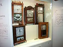 Display of Connecticut-made shelf clocks by various manufacturers.