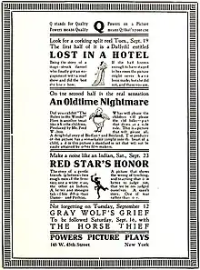 10. Banner advertisement for 1911 films of Powers Moving Picture Company, The Billboard (Cincinnati, Ohio), September 16, 1911, p. 71. Retrieved June 16, 2020.
