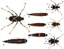2 Ancyronyx minerva adult, 3 Ancyronyx tamaraw adult, 4 Ancyronyx buhid adult, 5 Ancyronyx minerva larva, 6 Ancyronyx tamaraw larva, 7 Ancyronyx buhid larva, 8 Ancyronyx schillhammeri adult, 9 Ancyronyx schillhammeri larva